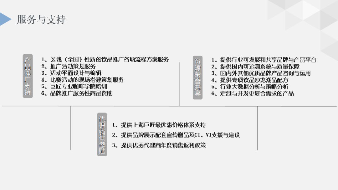 上海巨匠成立于2001年,主营咖啡、茶、固体饮料三大系列产品生产及运用研发。公司秉承“以德敬业、携手共进”的经营理念,坚持以客户为中心,快速响应客户需求,持续为客户创造长期价值进而成就客户,发展至今以“守信誉”“有特色”“高档次”“价格优”的特点赢得广大消费者的赞誉。