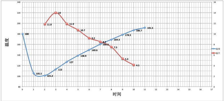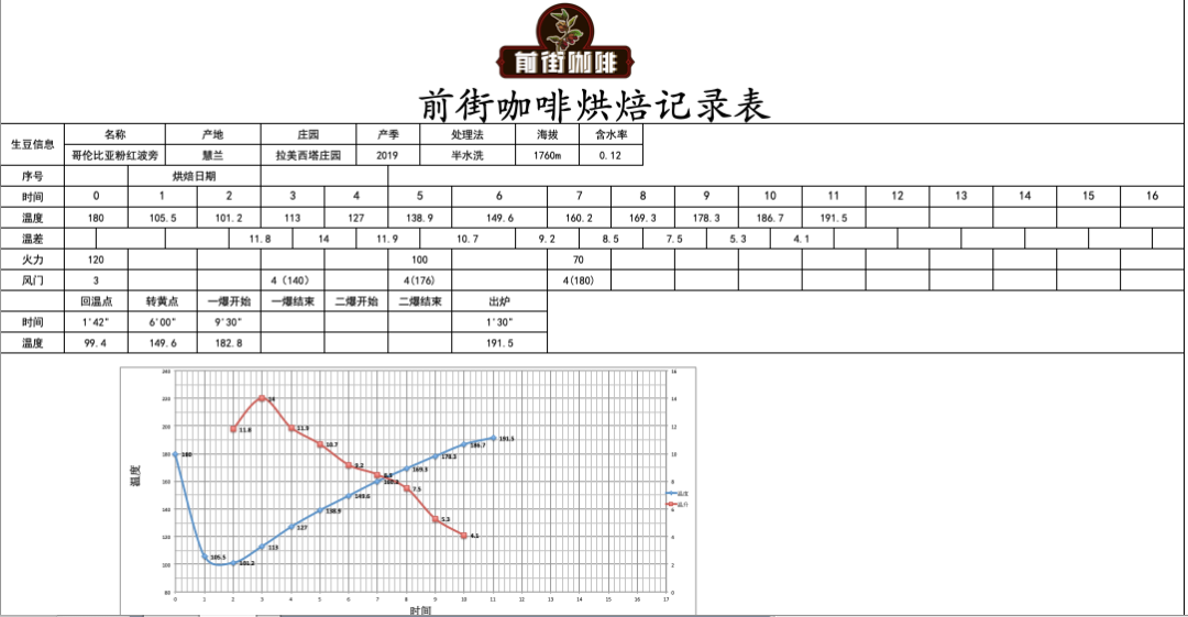 炉温至摄氏180℃入锅,风门开设3,火力为120;回温点1'42",炉温140℃时火力不变,风门开至4;此时豆表变为黄色,青草味完全消失,进入脱水阶段,在176℃时火力降到100,180℃时火力降到70,风门保持不变。