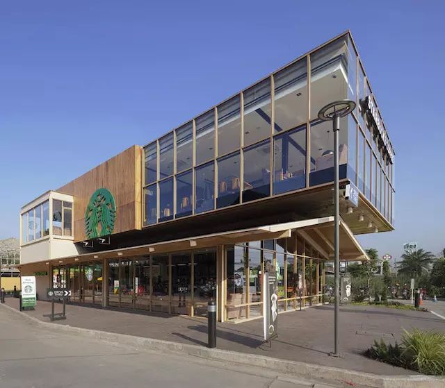 据说星巴克的每一家店都不一样,至少在一些知名的旅游景区,星巴克通常会融入当地的特色做精品店设计。作为一个面向终端产品的设计师或者企业,在销售时不得不考虑设计的本土化。星巴克的创始人 Howard Schultz 曾说过 Retail is Detail,因此,星巴克的店铺设计、布置、装饰等每一个细节都要求被充分的考虑,从消费者的角度考虑空间布局,追求极致的用户体验。星巴克在曼谷建成了一个与屋顶错位的玻璃盒子星巴克在曼谷开了一家特别的门店,将当地建筑特色和现代建筑手法融合。一楼有一个农舍似的三角屋顶,可以联想到传统的高脚楼。而二楼却是一个非常方正的玻璃盒子,与屋顶有些错位,非常特别。两层楼几乎都是玻璃墙面,可以让这里显得很通透,有好的视线看风景。到了晚上的时候,屋子里面的灯光透出来,又能让楼上的玻璃盒子成为很明显的标志,引人注目。