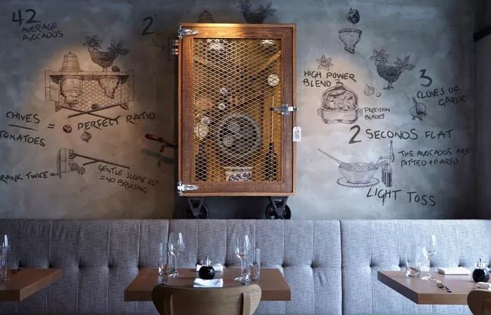 用餐区是“旅行纪念品”的集中展示。餐厅的整体风格是粗犷而随性的,就像长途旅行归来的旅者,虽然风尘仆仆,却带着丰富的故事。所以,这里从地板、墙面到天花,都只是简单地用水泥刷了一层,透着浅浅的工业味道,然而这并不妨碍它成为一块画布,上面充斥着各种有趣的涂鸦,以及来自各国的插画和饰物。这样一个故事性浓厚的别致空间,让用餐不只是单纯味觉上的享受,而且可以在不断的惊喜与发现中获得全方位的体验。