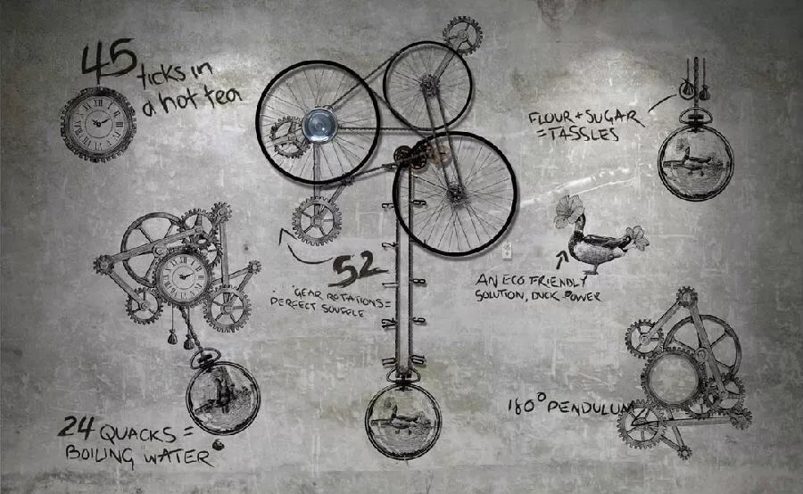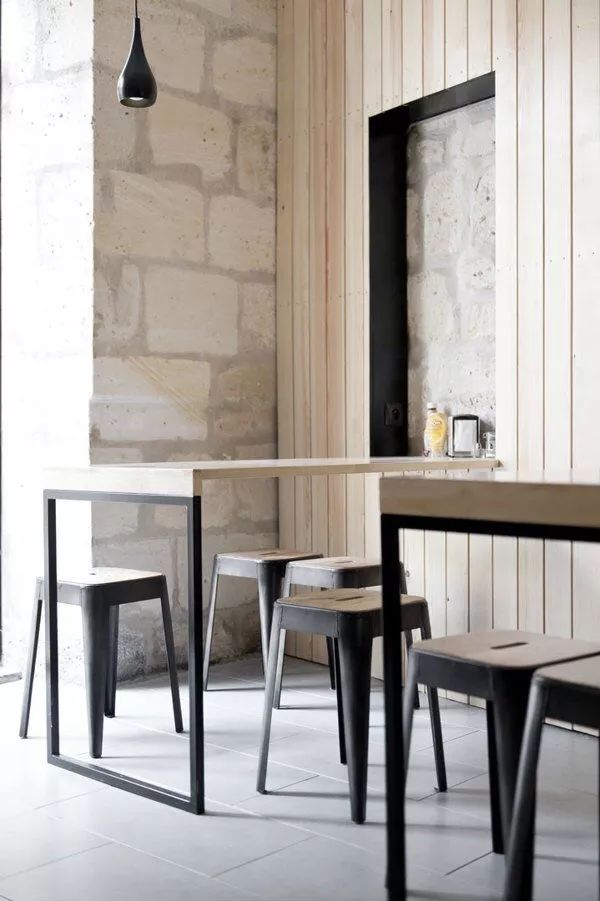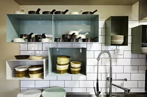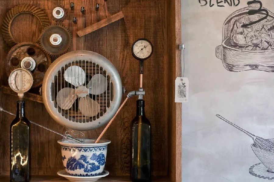 在餐厅里可以看到很多有趣的装置,有些是业主的收集,有些则是设计师的创意。比如吊在墙上的车轮和古旧的木箱,就连杯垫上面也藏着秘密,看上去是印满了水管图案,而如果将几块杯垫组合起来,就成了一个冷冻运输系统的草图。在靠墙的沙发座背后,还有一块别具风格的“书墙”,是设计师用许多本小说拼合而成的立体装饰,层层叠叠交错式的排列不仅丰富了墙面的设计,也将“旅者”一路上所收集的“游记”在这里汇聚起来。