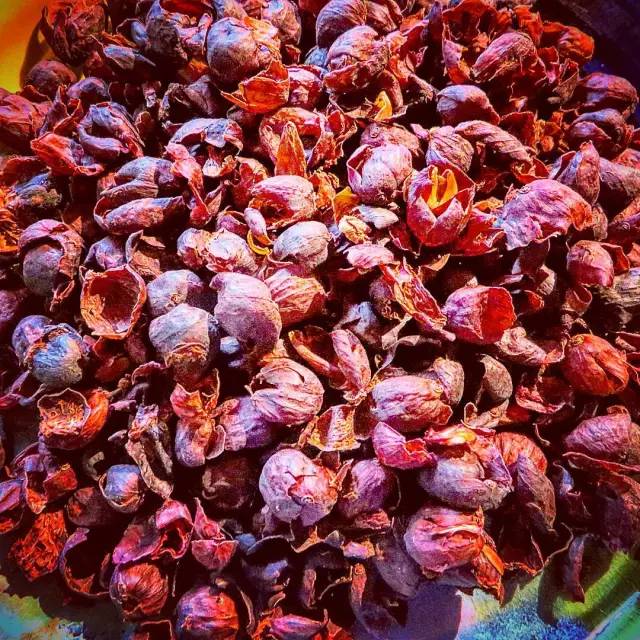 上图中的上面是一颗日晒后咖啡果横剖面,下面是一颗新鲜采摘的咖啡果横剖面。日晒法的咖啡果全部采用一种日晒专用的脱壳机器脱壳,这种脱壳机的口径比水洗法的略大,因为咖啡果体积比带壳豆更大,厚厚的外皮整个被一次性剥离。在有的地区咖啡果皮并不会被废弃,而是会被收集并清洗之后制成“咖啡果皮茶”,也门和埃塞俄比亚人有着饮用这种茶的长久历史。