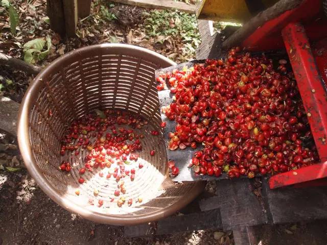 我们生活中吃桃子,是吃它的果肉部分;我们享用咖啡,却是将它的种子烘烤后磨碎泡水饮用,至于其他的果皮、果肉则全部舍弃。再加上咖啡种子长得很像豆子,大家自然而然称其为咖啡豆。在以后的描述中,为了简约、便于理解,我们依然采用咖啡豆的称谓,但是大家心里需要有数,咖啡豆不是豆。处理法存在的意义在于什么?咖啡果子长在树上,咖啡农将其采摘下时,它们长这个样子。