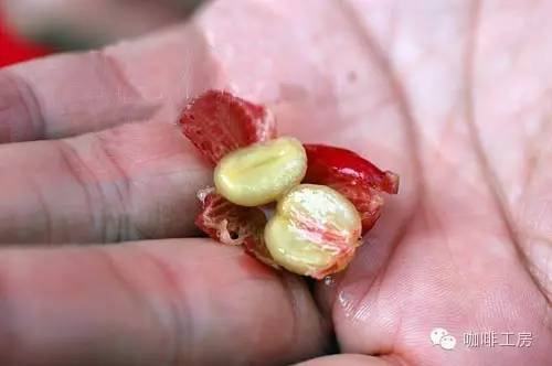 这5层分别是: 1.果皮、果肉(Skin/Pulp):咖啡豆的最外层包裹着浆果一般的果皮和果肉。除自然日晒法以外,经其他方法处理的咖啡豆在采摘后的几小时内必须去除果皮果肉。对于咖啡来讲,果皮和果肉是重要的副产品。在某些产地人们会用咖啡的果皮和果肉泡茶。业内人士习惯称咖啡的果皮和果肉为“果浆(Pulp)”,用来去除果浆的机器则被称为“去浆机”。 2.粘膜(Mucilage):在果皮和果肉之下,一层质地粘稠的粘液将咖啡豆严密地包裹着。由于这层粘膜粘性极大且糖分极高,人们习惯称之为“蜜(Honey)”。不仅是咖啡,很多水果内部都附有一层粘液。 3.羊皮纸(Parchment):在粘膜内部,一层由纤维素组成的薄膜包裹着咖啡豆。经干燥后,这层薄膜外观酷似羊皮纸,因此得名。 4.银皮(SilverSkin/Chaff):在羊皮纸内部还有一层更薄的薄膜包裹着咖啡豆。由于颜色富有光泽且泛有银色,人们习惯称之为“银皮”。这层银皮会在烘焙时脱落。通常你在研磨咖啡时发现咖啡粉中有些许银色碎屑。这些碎屑正是烘焙时未能与咖啡豆剥离的银皮。 5.咖啡豆:每粒果实都含有2粒咖啡豆(除一荚单粒豆Peaberry除外。这种咖啡的果实内部只含有一粒咖啡豆。通常情况下,每批咖啡豆中都会有5%是一荚单粒豆)。咖啡豆经过干燥和处理之后便可进行烘焙。