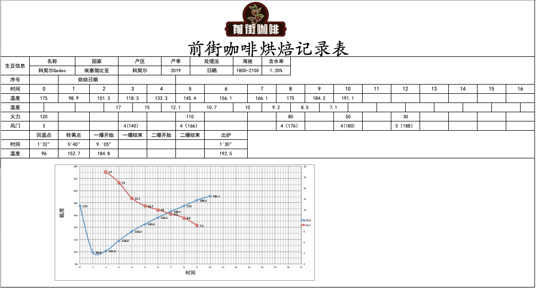 曲线分析像耶加雪菲的豆子,前街的烘焙师经常会以浅烘的方式去呈现它的花香和水果调性。科契尔Gedeb产区转黄点 5'40,一爆开始在 9'05",温度是184.8℃,一爆发展1'30" 出炉,温度192.5 ℃。