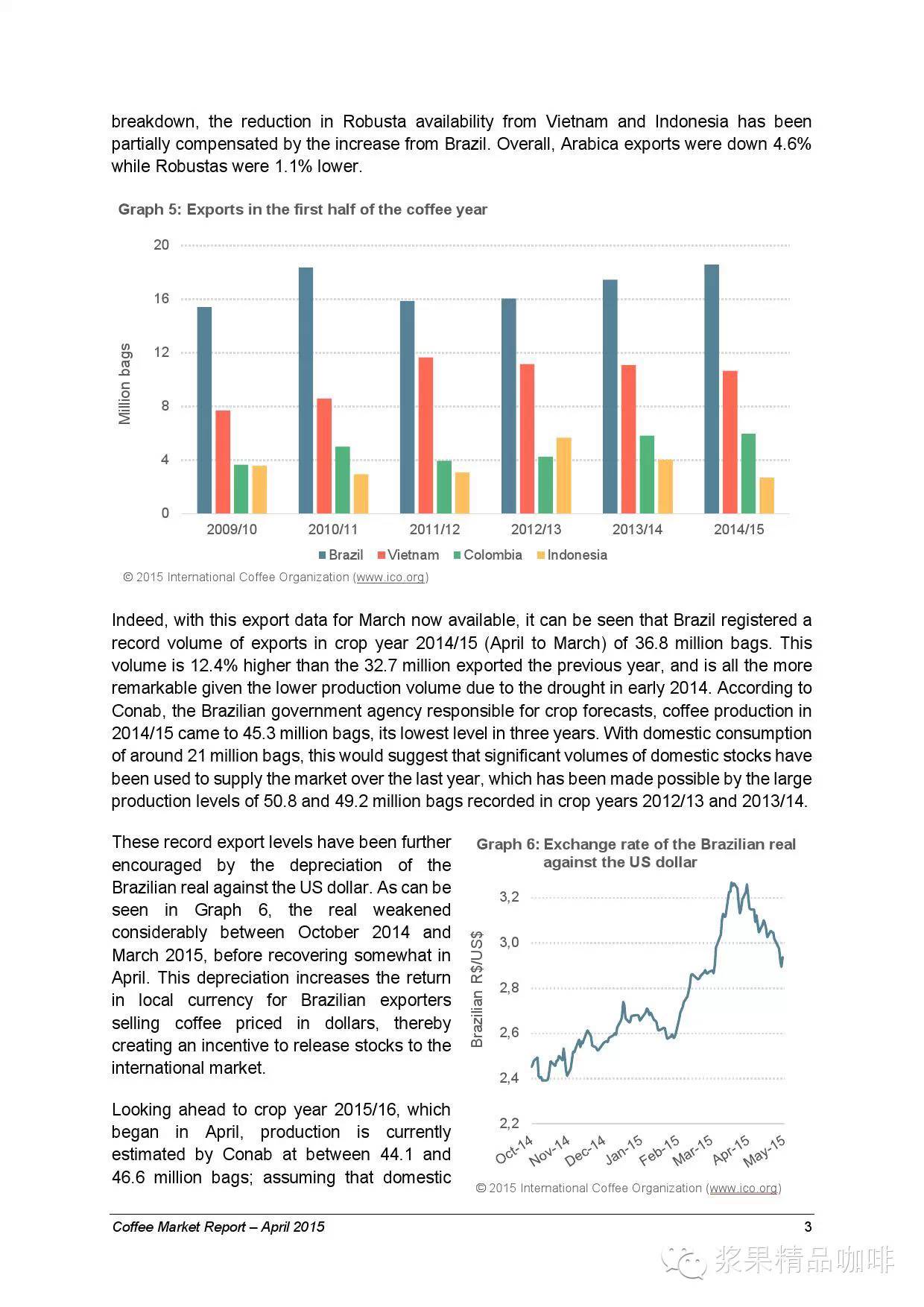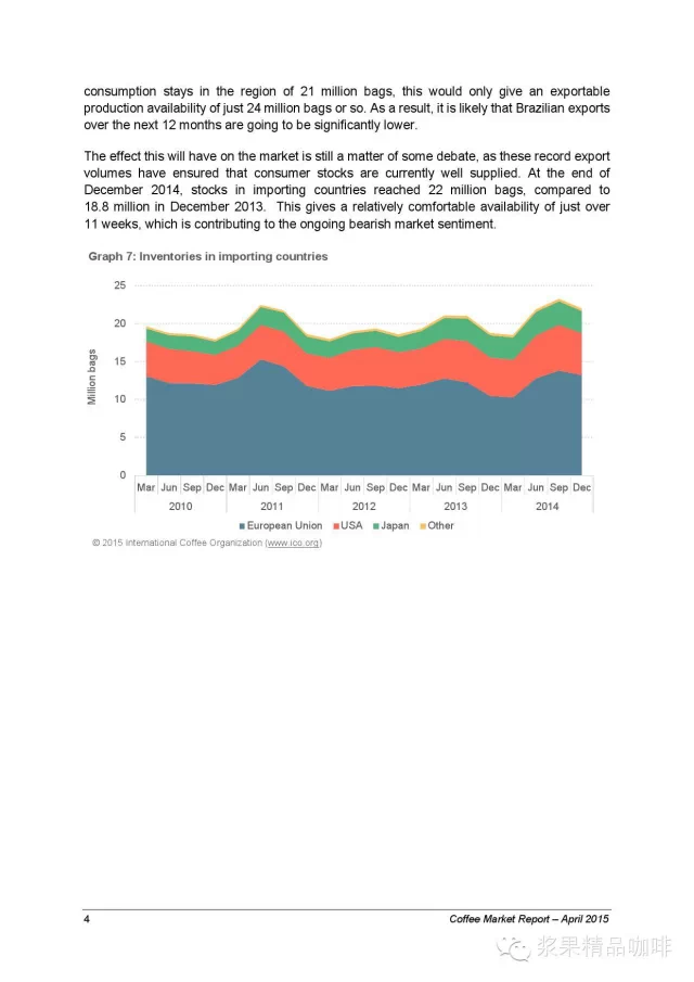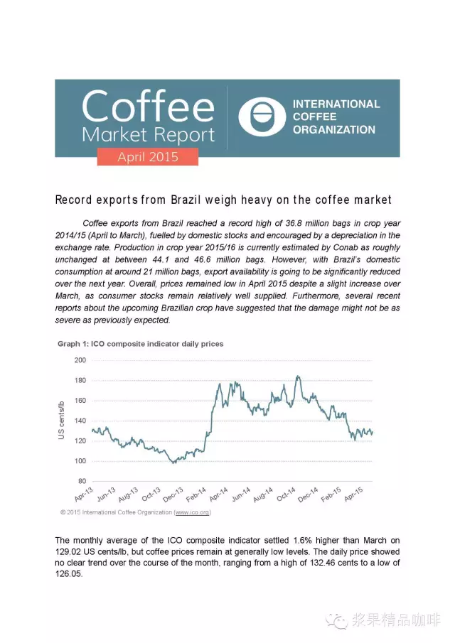 2014年4月到2015年3月,巴西出口生豆3.68亿袋突破世界纪录,得力于国内股市和汇率贬值。预计2015-2016年度总出口将在4.41亿袋到4.66亿袋之间。但是巴西国内的咖啡消耗在每年2.1亿袋,因此明年的出口总额将会降低。总体来说,由于咖啡产量供大于求,2015年4月所报出的咖啡出口价仍然处于走低状态,即使在三月份的时候出口价稍有增高。