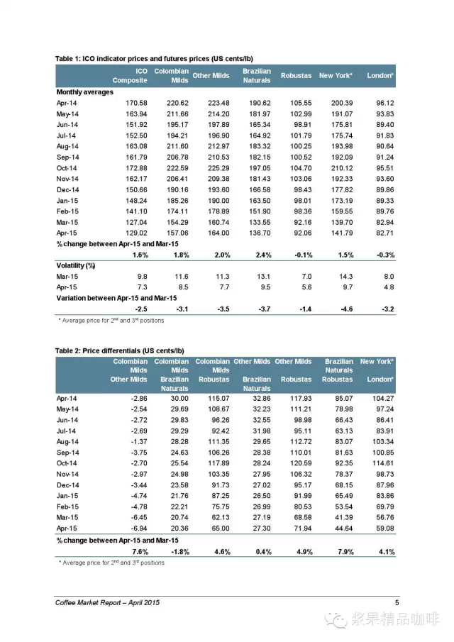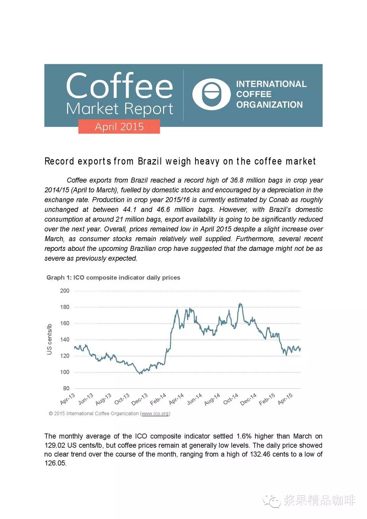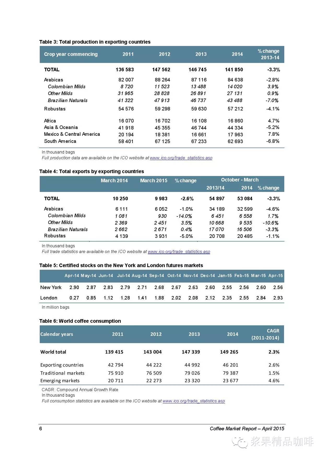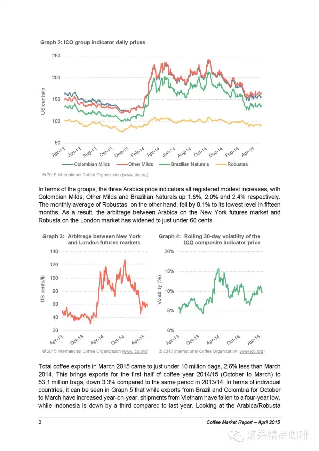 2015年3月,世界咖啡总出口量不高于1千万袋,相比2014年3月减少了2.6个百分点。从而导致在2015-2015年度(10月到3月)总出口量仅为5.31亿袋,相比2013-2014年度的总出口量减少了3.3个百分点。从单一的出口国来看,巴西和哥伦比亚的出口量相比同期有增长趋势,越南的出口量创4年内新低,印尼出口量只为去年的三分之一。在巴西,阿拉比卡的出口量降低了4.6个百分点而罗豆的出口量降低了1.1个百分点或更低。