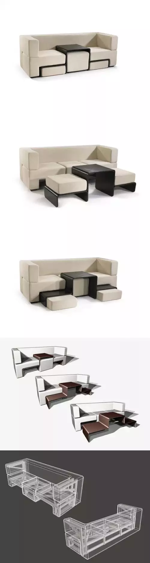 8、「多功能」来自波士顿的设计师 Matthew Pauk 设计了一款卡槽沙发,实际上是一套动态家具,主体由一个沙发、一张弯曲木做成的“凸”字形滑动桌子、以及两个厚软垫组成,融合了沙发、咖啡桌和坐垫的功能。