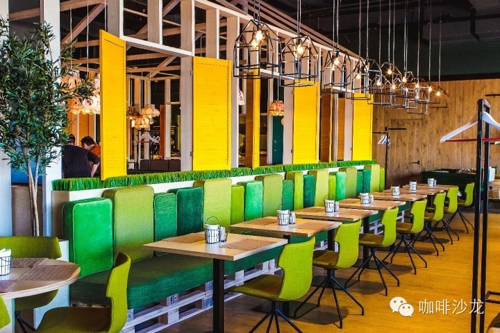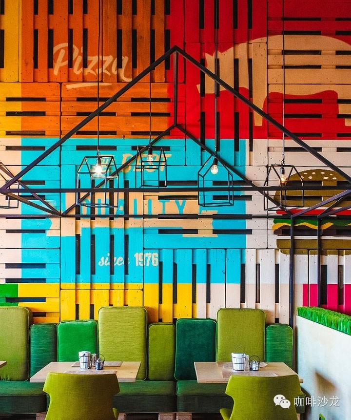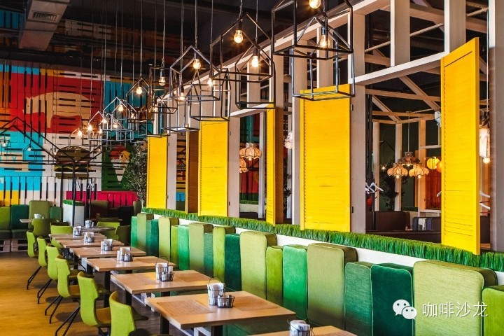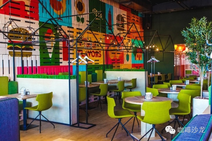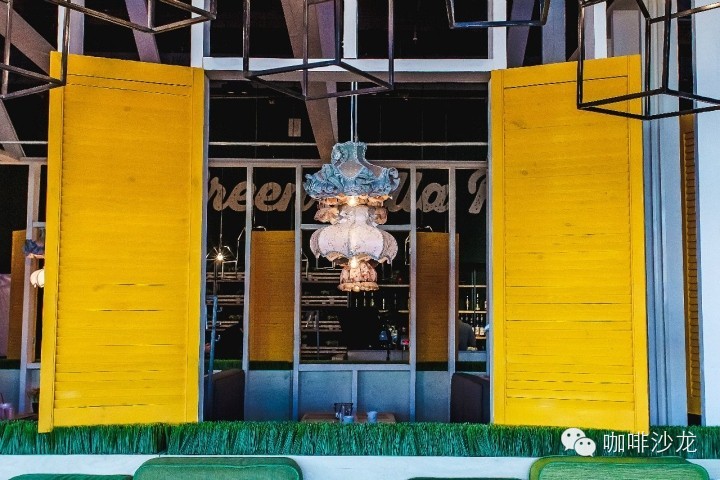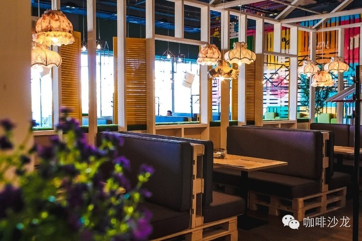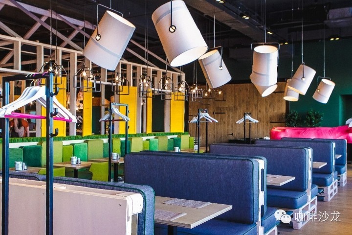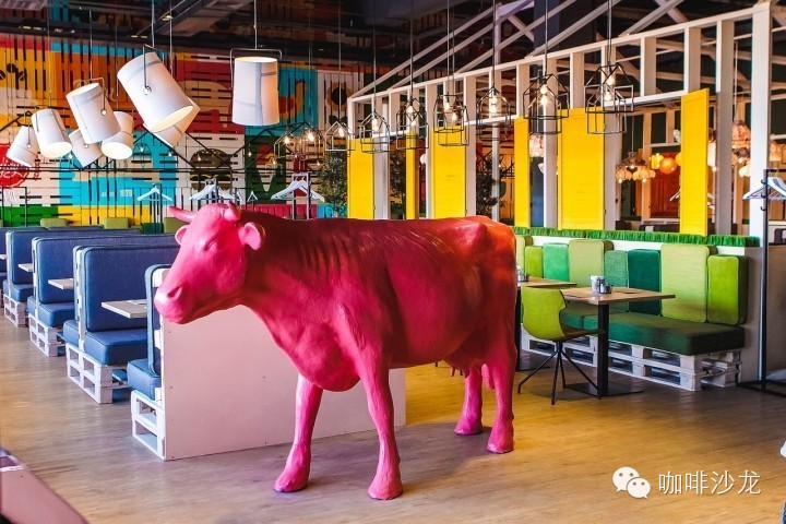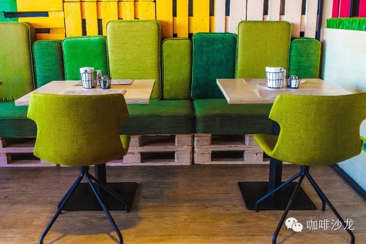 在设计的操作中,我们对颜色的选择是极为谨慎的过多的颜色在碰撞中有太多的不可预期性消费者对颜色的反映也极为敏感这个咖啡馆无疑是挑战了色彩的极限我们对这样风格的设计在国内是否吃得开,抱怀疑态度