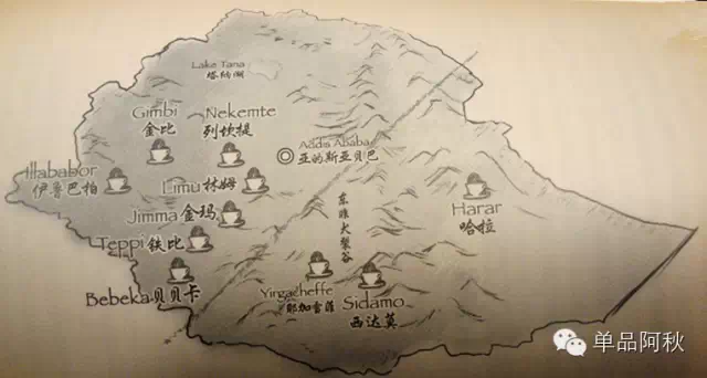 埃塞俄比亚被东非大裂谷分割成东西两半壁,各自演化!大裂谷以西的产区包括塔纳湖的齐格、金比、列坎提、伊鲁巴柏、林姆以及咖法森林的金玛、彭加、铁皮、贝贝卡。东半壁产区则包括名气较大的哈拉、西达摩和耶加雪菲。