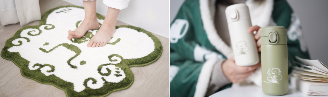 它是用中国传统的石狮子进行的再设计。我们做了一些周边,比如杯子。我们做周边的策略是只卖不送,比如满99块钱就可以送一个杯子。线上品牌会经常进行一些折扣,但经常做折扣会对品牌造成损伤。满99元送杯子,就不会让产品有很大的折扣,而且周边也可以有很大的稀缺感。我们还做了一些年历、海绵擦、收纳袋、徽章、保温杯、抱枕,用周边打造咖啡的生活方式。比如,我们做了一个地毯,在双11的时候买888才会送。我们有600多位用户为了地毯,购买额度超过了888块。