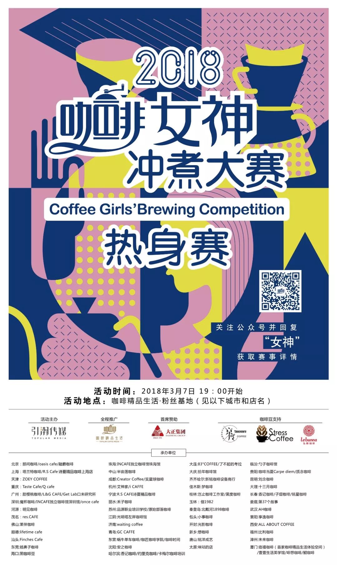 2018年3月7日女生节晚上7点引潮传媒联合了全国66家咖啡馆将同时办女神热身赛2018咖啡女神冲煮大赛·热身赛最北到齐齐哈尔,最南到海南今天就抢在最前头看看各地参赛女神颜值有多高