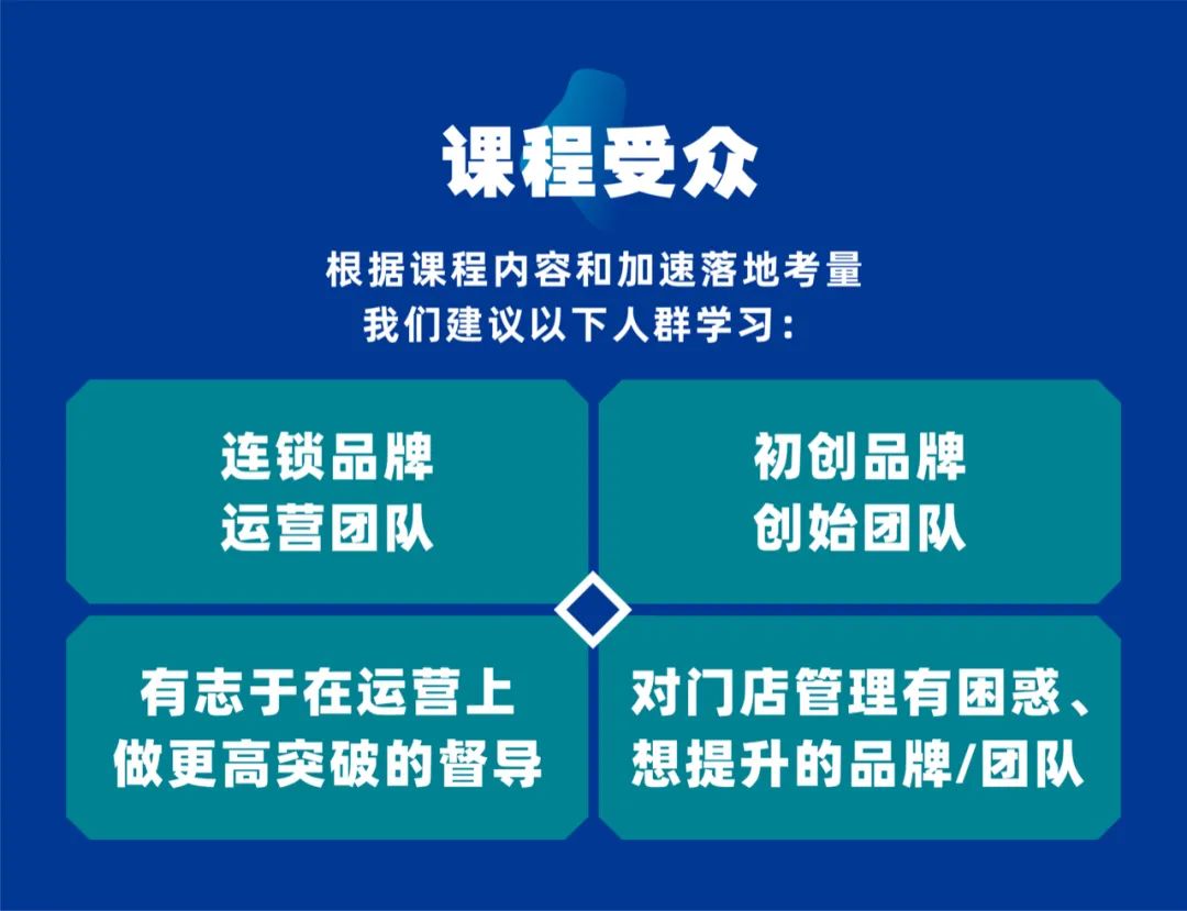 - 另外,这节课也很适合处于初创阶段的品牌创始团队亲自学习,不知道怎么管理加盟商、不知道如何搭建运营体系,听完就有方向了。