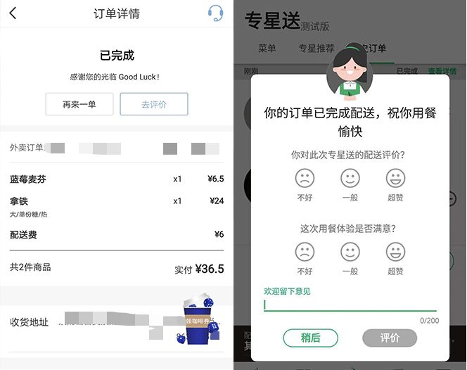 随后,拿到瑞幸咖啡不管是饿了么小哥也好,还是顺丰小哥也罢,快,是他们共同的标签。历经16分钟,两份产品都已经到手。比预计时间整整缩短了一半。再打开星巴克和瑞幸的APP,发现星巴克直接弹出了对此次订单进行评价的对话框,而瑞幸,则显示订单完成,要点击“去评价”才可对此次订单进行评价。