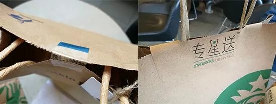 瑞幸封口处(左)和星巴克封口处(右)即使只点了1杯咖啡,两个品牌均在纸袋里放了杯托。