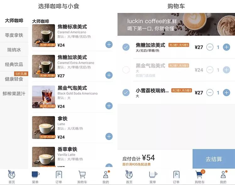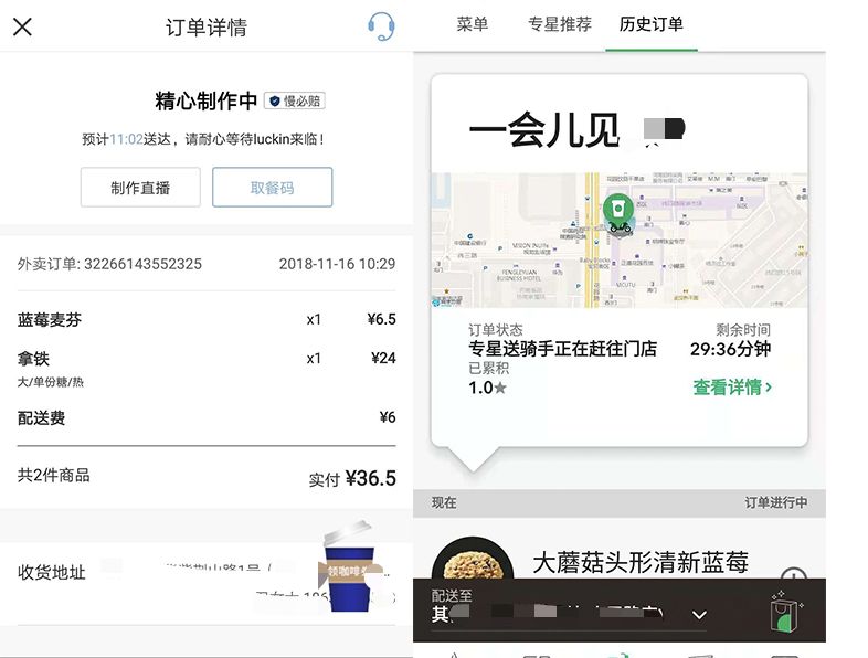 左图为菜单栏,右图为购物车产品也就是说,如果你并不常点瑞幸的话,就很有可能挑到一款“存在但不能外送”的产品。为了可以更加全(mei)面(chi)观(zao)察(fan)到外送包装,我们各点了一杯咖啡(拿铁),和一款轻食(蓝莓麦芬)作比对。在忍痛拒绝了“满35元免运费”和“第二杯我们请”的优惠下,最终的价格为星巴克59元 (含配送费9元);瑞幸36.5元(含配送费6元 )。在瑞幸和星巴克选择好产品后,并在10点30分同时提交订单。