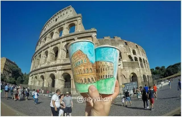 Berk Armagan22岁的土耳其艺术家自学成才、周游世界如何将艺术与旅行结合在一起呢?↓↓↓Berk的做法是,带着最常见的中号咖啡杯,用白色的纸杯当做画布,绘出即将到访的旅游景点或事物(著名的&非著名的),并带到那里与实景合照。