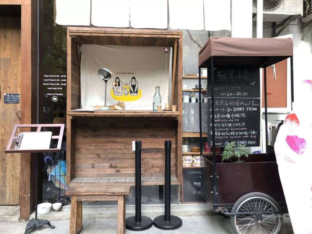 看场景,把顾客牢牢吸引在店外小食门店前的装饰,堪称丰富:先是一辆摆满植物的黑色三轮推车,推车上放了块黑板写明营业时间和供应的餐食;旁边放置了一个说不上来叫什么的小柜子和凳子,很适合拍照就是了;再再往旁边,就是个放菜单的小架子。
