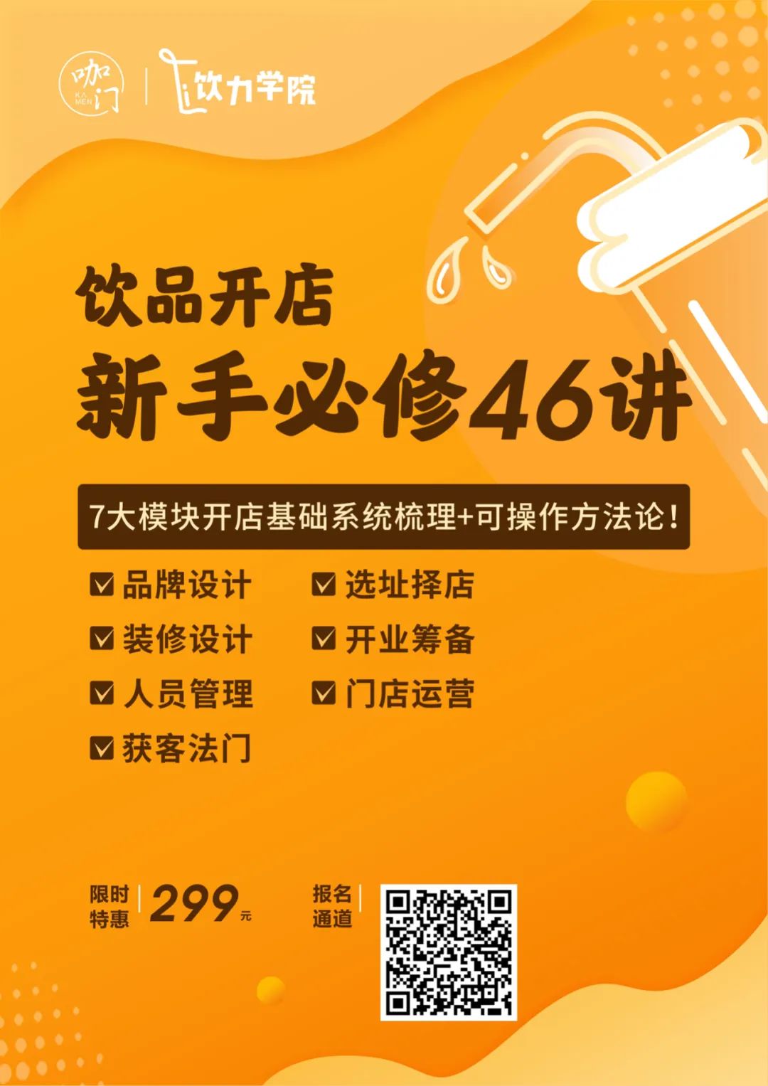 这是一门什么样的课程?这门课程,致力于帮助刚刚入行或者准备开店的饮品创业者,通过学习,对开店的核心环节有系统的了解和实操处理方式,并结合餐饮、零售案例分析,汲取头部品牌实践出的精华,避开大坑。简而言之,就是帮助创业者迅速了解开饮品店是一个什么样的事情,要做好哪些工作。具体来讲,课程分为7大模块:1、如何从开第一间店就打出品牌?做品牌重要,但单店、小店也能做品牌吗?其实,做品牌和踏踏实实开小店并不冲突,而是经营中顺理成章、水到渠成的一部分,如何从创业初期就有品牌思维,进行前置思考?2、怎样选到一个好铺位?不夸张地说,很多情况下选址是决定饮品店成败的关键,有人接连在选址上栽跟头,有人能从选址借势提升门店的影响力,选址策略是开店前的重要一课。