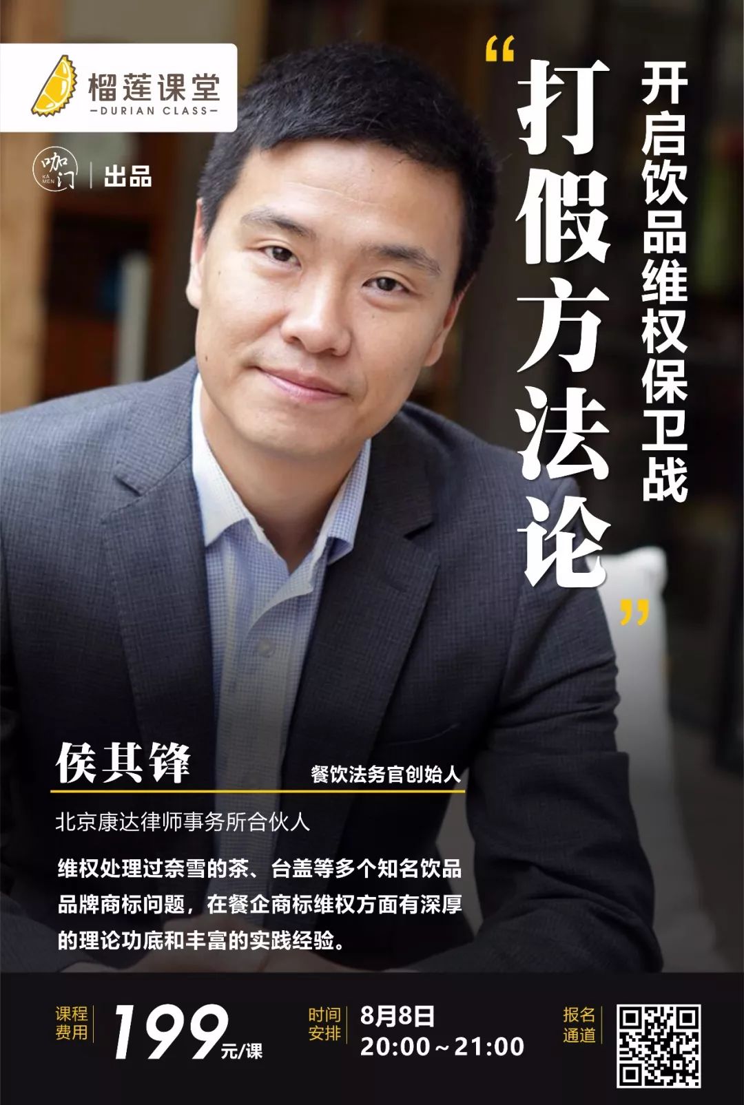侯其锋律师北京康达律师事务所合伙人,执业超20年,聚焦餐饮行业7年的专业律师。侯律师为餐饮行业提供专业法律服务,维权处理了奈雪的茶、台盖等多个知名饮品品牌的商标问题;担任乐凯撒披萨、陈鹏鹏鹅肉饭店、遇见小面等多家知名餐企法律顾问,在餐企商标维权方面有深厚的理论功底和丰富的实践经验。担心课程太理论不实用?侯律师说了,“课程全部是案例,都是自己打假的经验!”想把奶茶店从1家开到10家、100家,做好商标维权是首要准备。你确定不报名听听?2“榴莲课堂”介绍课堂简介▼榴莲课堂是咖门尝试的知识培训内容,期望以轻快的形式带给行业更多角度的思考和指导。每期邀请一位讲师进行线上内容分享,他们或许是品牌创始人、策略规划者,也可能是跨界观察者、专业课程导师,还可能是咖啡师、店长……(欢迎有实力的你自荐~)希望通过1个小时的“轻学习”来引发思考、解决问题。每期一个主题,遵循一个宗旨:听得懂、学得会、用得到。点蓝字,了解上两期榴莲课堂精彩内容: