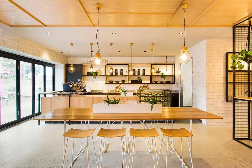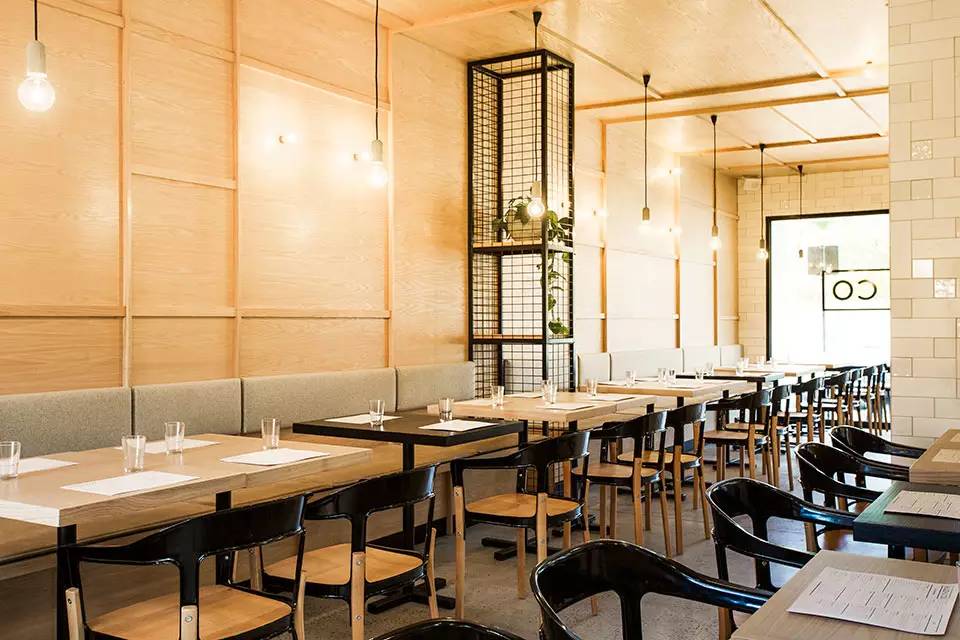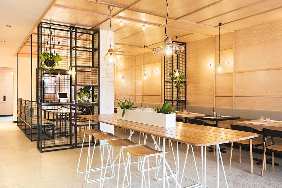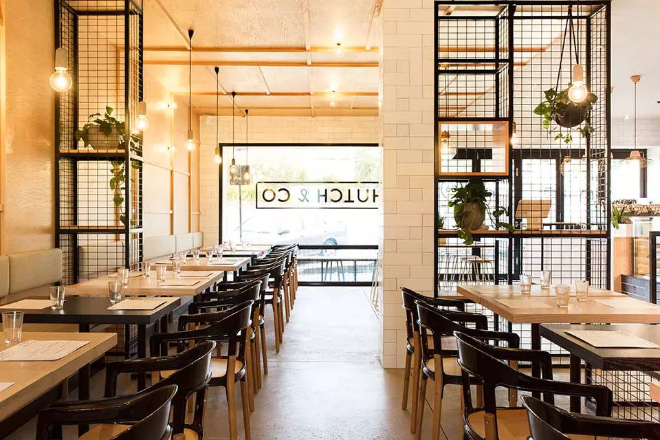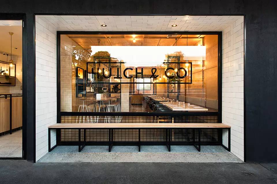 一间始于19世纪的铁器店Hutchinson’s,如今被澳大利亚Biasol: Design Studio改造成一个现代化的餐厅和咖啡厅。大LOGO--Hutch & Co 醒目的印在餐厅挑檐的底部以及橱窗、还有入口门上。