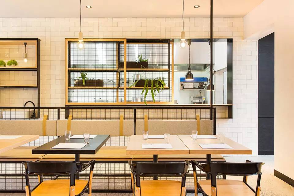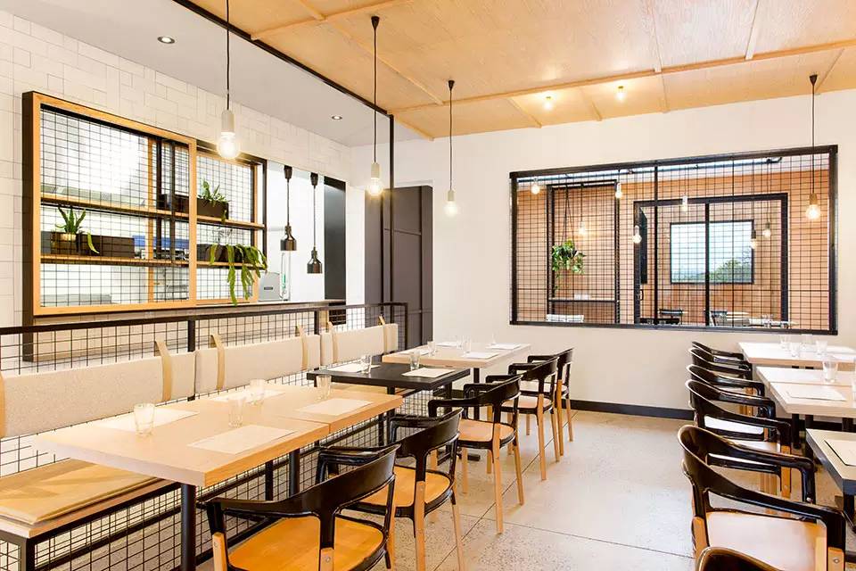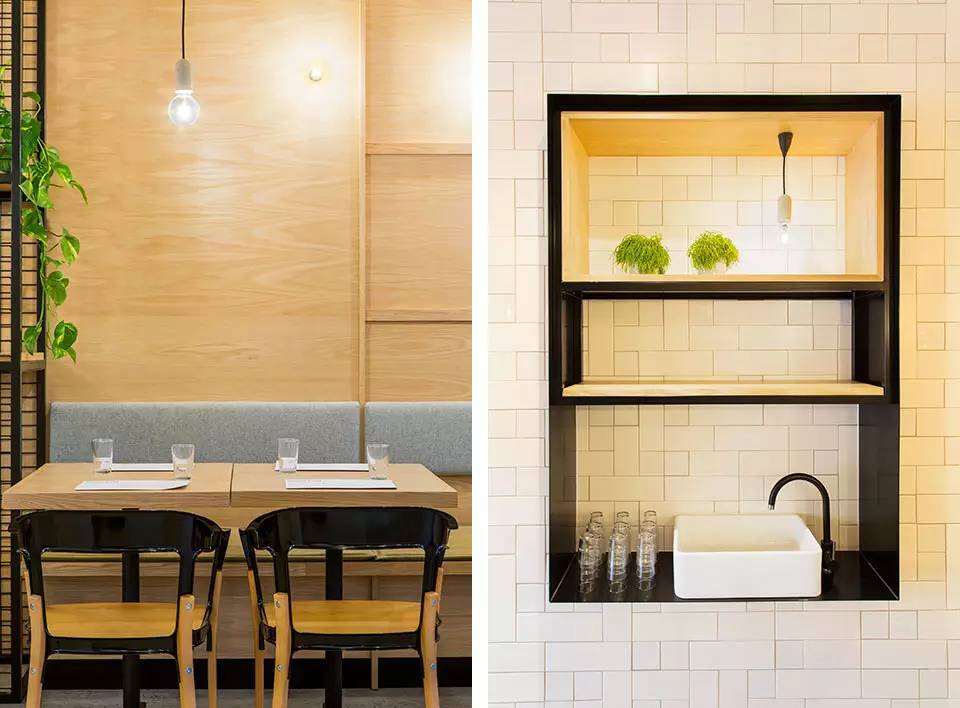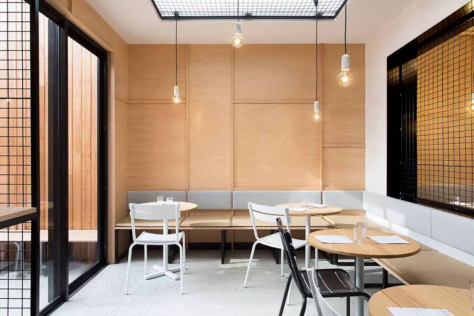 设计师用浅色的美国橡木,哑光及高光瓷砖,混凝土饰面以及黑色钢构件材料等材料之间的对比,再经过独特设计的暖色光源灯和灰色的软质靠垫为空间营造出亲密感。空间上为了对现有建筑的延伸扩建,所以分为两个用餐区,入口附近的室内用餐区域和餐厅深处的室外用餐区域。