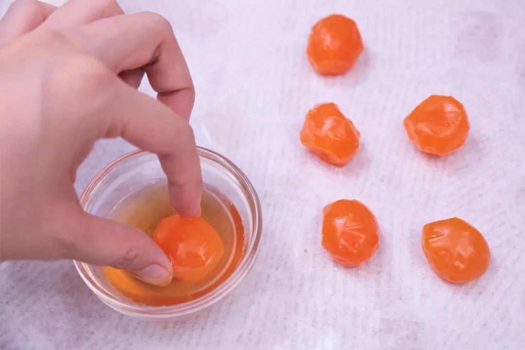 ②咸蛋黄均匀沾上白酒,用180摄氏度烤5-10分钟,取出仔细捣碎。