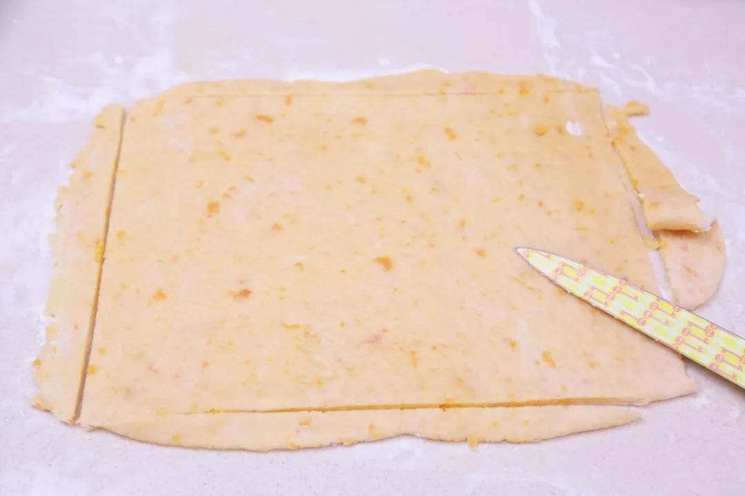 ⑦将完成折叠的面皮,擀成3-4mm的厚度,修去边缘,用叉子叉出孔洞,再分切成大约2*6cm的长方形。