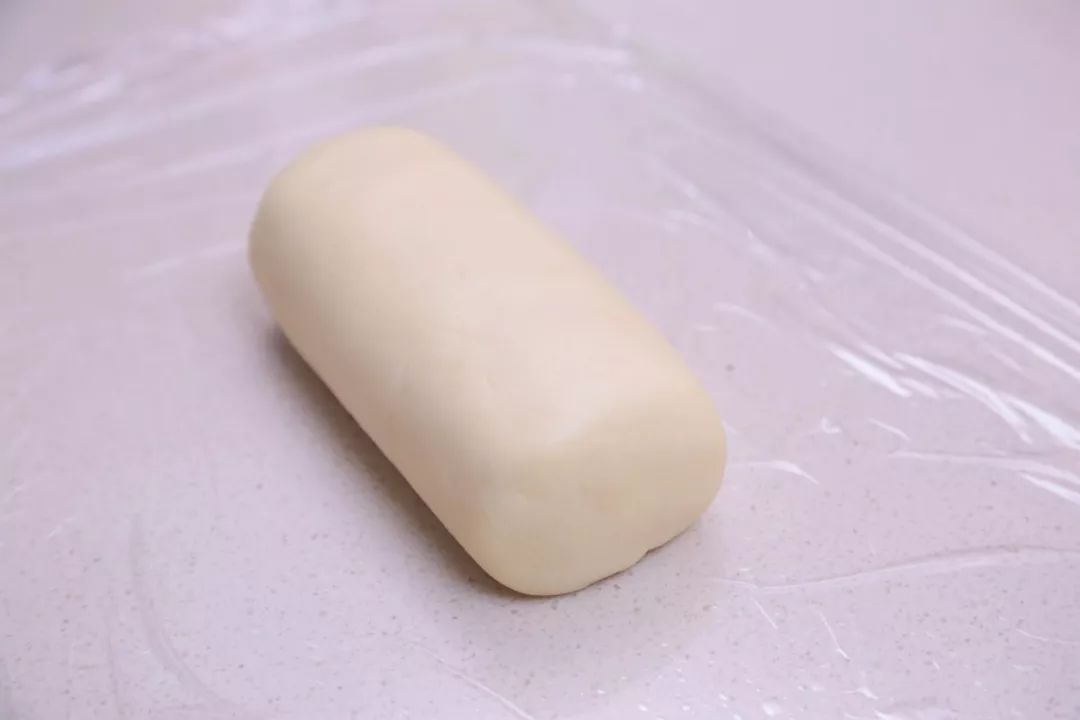 ④将面团塑形成较粗的长条状(切面看起来应是有圆角的长方形),用保鲜膜包起冷藏约20分钟或冷冻约10分钟,至面团稍微有硬度、方便塑形的程度。