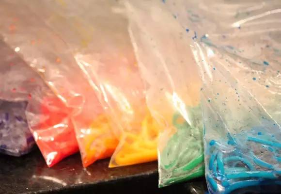 ①将意面按照说明煮好,煮的过程中将30ml水与适量的色素混合制成色素水(想染多少种颜色就做多少份)。②面条煮好后沥干水分放在自来水下冲冷。然后将冷下来的面条放进放了色素水的塑料袋中小心用手隔着塑料袋混合。混合好后即可放上喜爱的酱料享用。