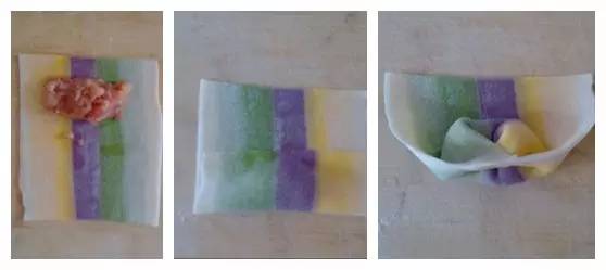⑥然后取一张,在下方放上拌好的肉馅。⑦皮往上卷一层,包住肉肉。⑧然后把下面两个角向中间捏紧,就包好了。
