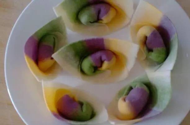 ①紫甘蓝榨汁,菠菜打成泥,南瓜蒸熟压成泥,加入面粉,分别揉出紫色,绿色,黄色的面团,再揉两个白色的。②擀成五个较厚的面片,然后依次叠起来,白色,绿色,紫色,黄色,白色。③叠好后,切下一条,平放在案板上擀成长长的薄片。