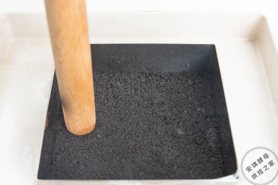 ①融化的椰子油或黄油与饼干碎拌匀;倒入模具后用擀面杖压平压实,放入冰箱冷藏备用