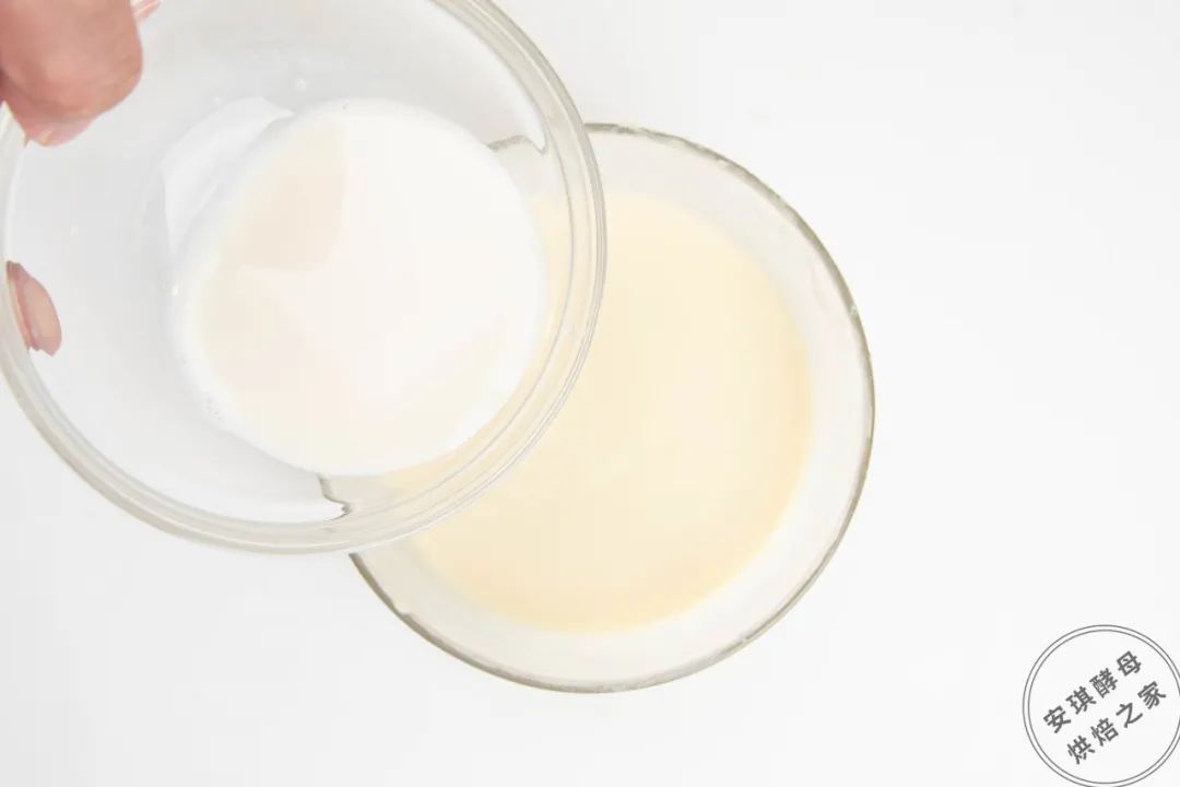 ③细砂糖与软化好的奶油奶酪搅匀后分两次加入椰浆,混合均匀后倒入牛奶吉利丁,并与打发至7-8成发的淡奶油搅匀