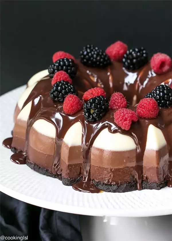 模具:8寸萨瓦林硅胶模具淡奶混合物牛奶500ml淡奶油1000ml白巧克力层白巧克力碎250g吉利丁7g牛奶巧克力层牛奶巧克力碎250g吉利丁7g黑巧克力层黑巧克力250g细砂糖20g吉利丁7g奥利奥底奥利奥饼干碎120g黄油(融化)114g甘纳许淡奶油120g半糖巧克力120g