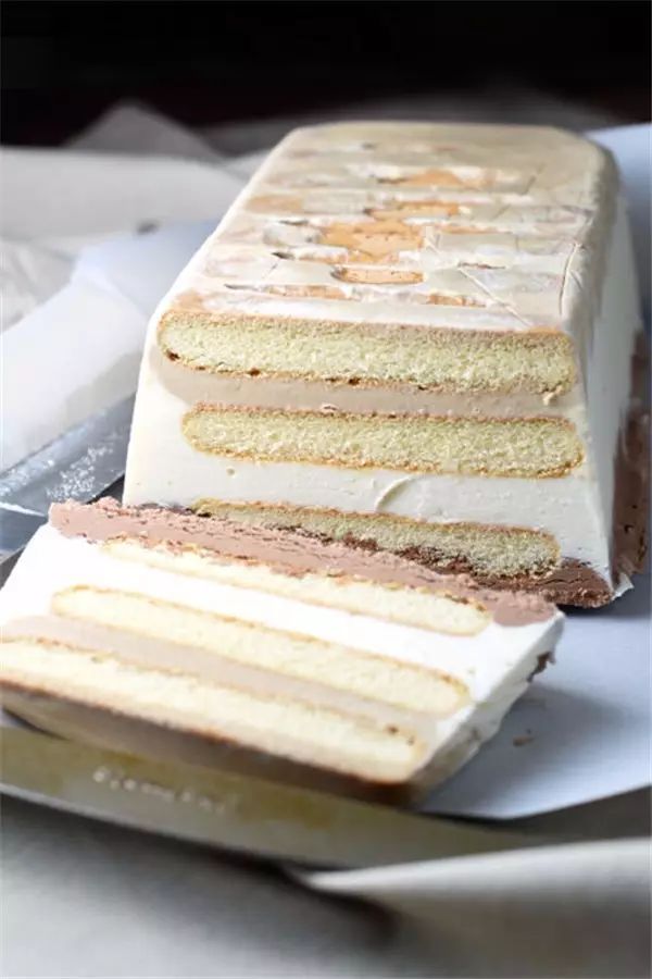 ①吐司盒底部和侧壁都包上保鲜膜备用②吐司盒底层铺8根手指饼干③咖啡酒和咖啡冰激凌(稍微放软一点),用电动打蛋器打至均匀,铺在第一层手指饼干上,抚平,再铺第二层手指饼干,放入冰箱冷冻30分钟以上④马斯卡彭乳酪、香草精和香草冰激凌(稍微放软一点),用电动打蛋器打至均匀,铺在第二层手指饼干上,抚平,再铺第三层手指饼干,放入冰箱冷冻30分钟以上⑤巧克力冰激凌(稍微放软一点),用电动打蛋器打至均匀,铺在第三层手指饼干上,抚平,用保鲜膜盖好,放冰箱冷冻4个小时以上⑥淡奶油煮沸,冲入巧克力碎中,搅拌至巧克力融化,混合均匀成巧克力甘纳许⑦冰激凌食用前,提前10分钟取出略软化,脱模,撕掉保鲜膜,配甘纳许或者可可粉服用效果更佳