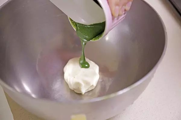 ⑤取一份面团加入全部的抹茶牛奶用手揉匀。