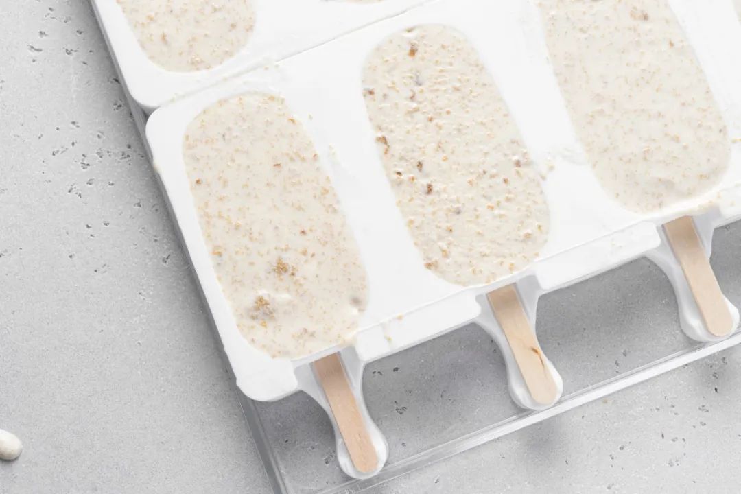 8、装入裱花袋内,挤入冰棒模具内,并插入冰棒木柄,抹平整,注意:此时使用的任何工具都应是冰凉的状态(提前储存在冰箱中)。
