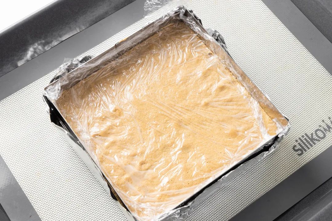 4、倒入用铝箔纸包底的20x20CM方形模具框内,抹平。