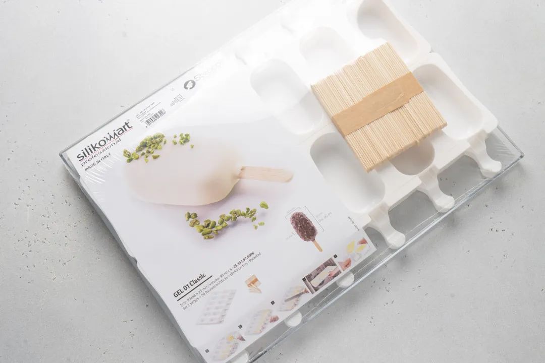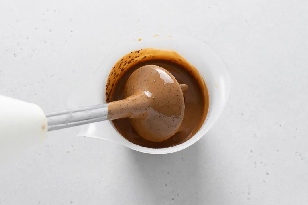 5、倒入制冷容器内,用搅拌棒/手持均质机搅拌乳化,快速降温至4~6℃,期间,将准备好的冰棒硅胶模具(Silikomart GEL 01)放入冰箱内待用。