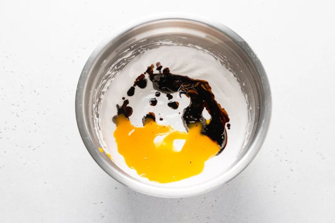 2、将蛋黄和咖啡精加入,用胶刮刀轻轻拌匀。