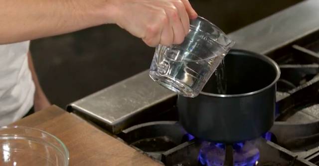 ①在小锅中倒入水和白砂糖,小火加热,搅拌至白砂糖完全融化,关火放凉备用。