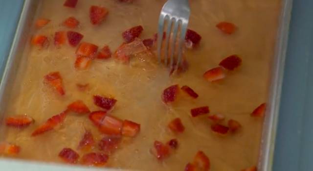 ⑤将草莓洗净,去除果蒂,切成小块,洒进材料④中。