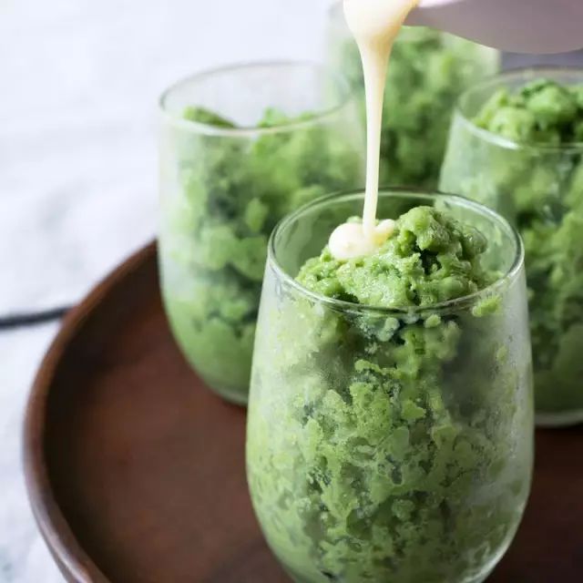 ③将材料②放入冰箱中,冷冻至少四个小时,直至起完全凝固。④在食用前,将它从冰箱里拿出来,在室温下放置5-15分钟,用叉子在抹茶牛奶冰表面使劲刮出冰沙颗粒即可。
