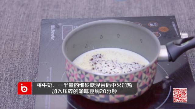 制作咖啡卡仕达酱:①牛奶中加入压碎的咖啡豆(或速溶黑咖啡)和一半的糖,加热至完全溶解,约20分钟。