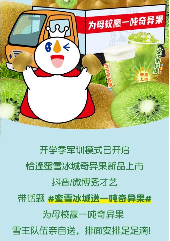 蜜雪冰城“开学军训”话题推新品蜜雪冰城针对开学季,以“开学军训模式”邀请学生和广大网友们一起参与开学才艺大PK,在抖音或微博等社交媒体秀才艺,为母校赢一吨奇异果。同时,雪王还邀请大家在评论区留言互动,一起分享新学期的趣事,会送出大卖的“雪王吨吨桶”周边。一时间,评论区在读学生和已毕业的“社畜”们都来分享那些学生时光里不可磨灭的回忆,雪王还亲自下场互动,顺带宣传了一波才出的新品奇异果系列。