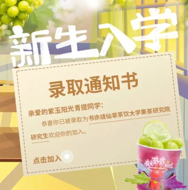 借开学话题与消费者互动书亦烧仙草也利用开学季的热点,将新品“紫玉阳光青提”以“新同学入学”的方式介绍给大家,这种“接地气”的宣传新品方式增添了不少趣味。