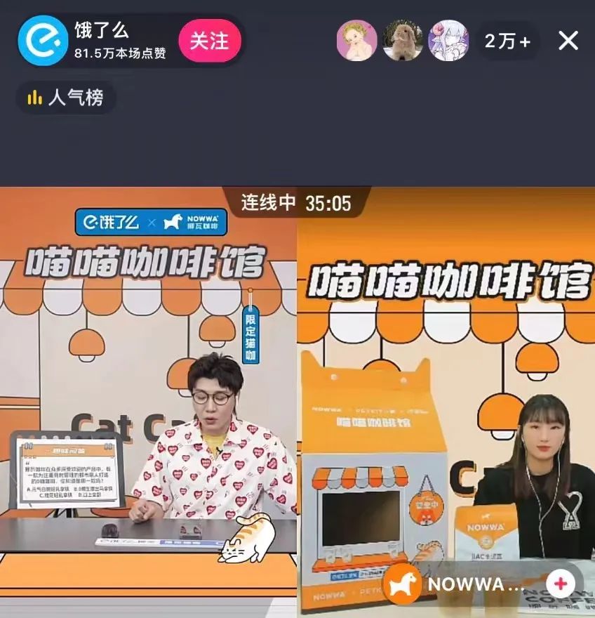挪瓦喵喵咖啡馆活动活动立意,可爱的猫咪可以治愈人类的精神疲惫,小佩作为智能化宠物用品为猫主子提供更贴心、更便捷的生活体验,NOWWA的咖啡也一样,能为消费者带来愉快与放松的情绪价值,饿了么则是手段途径,通过它使得一杯咖啡能够随时随地陪伴消费者。9月13日下午2时,饿了么抖音直播间首个合作品牌选定挪瓦咖啡,与其连麦交流,为活动引流。在饿了么直播间内,通过与NOWWA、小佩互动提问,向观众分享有关咖啡的文化知识与猫咪常识科普,同时引导观众进入“喵喵咖啡馆”超级限定会场,关注量超过10W+。直播期间,页面右下方则会弹出“喵喵咖啡屋”的提示框,点击即可进入饿了么专场页面,直接下单NOWWA咖啡。