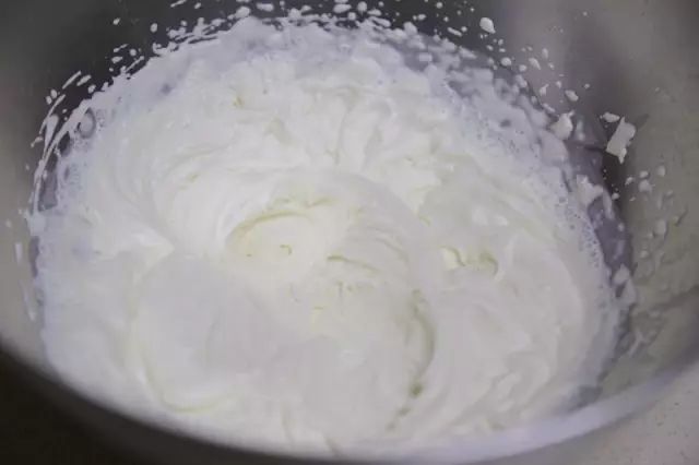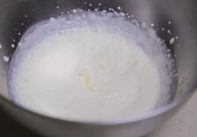 ②一个半小时后,淡奶油加入炼乳和椰浆混合打发到缓慢流动、有明显纹路的状态