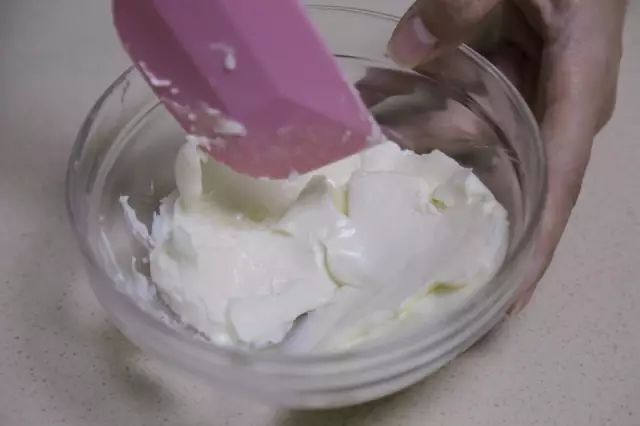 ③倒入软化的奶油奶酪中,用手动打蛋器搅匀